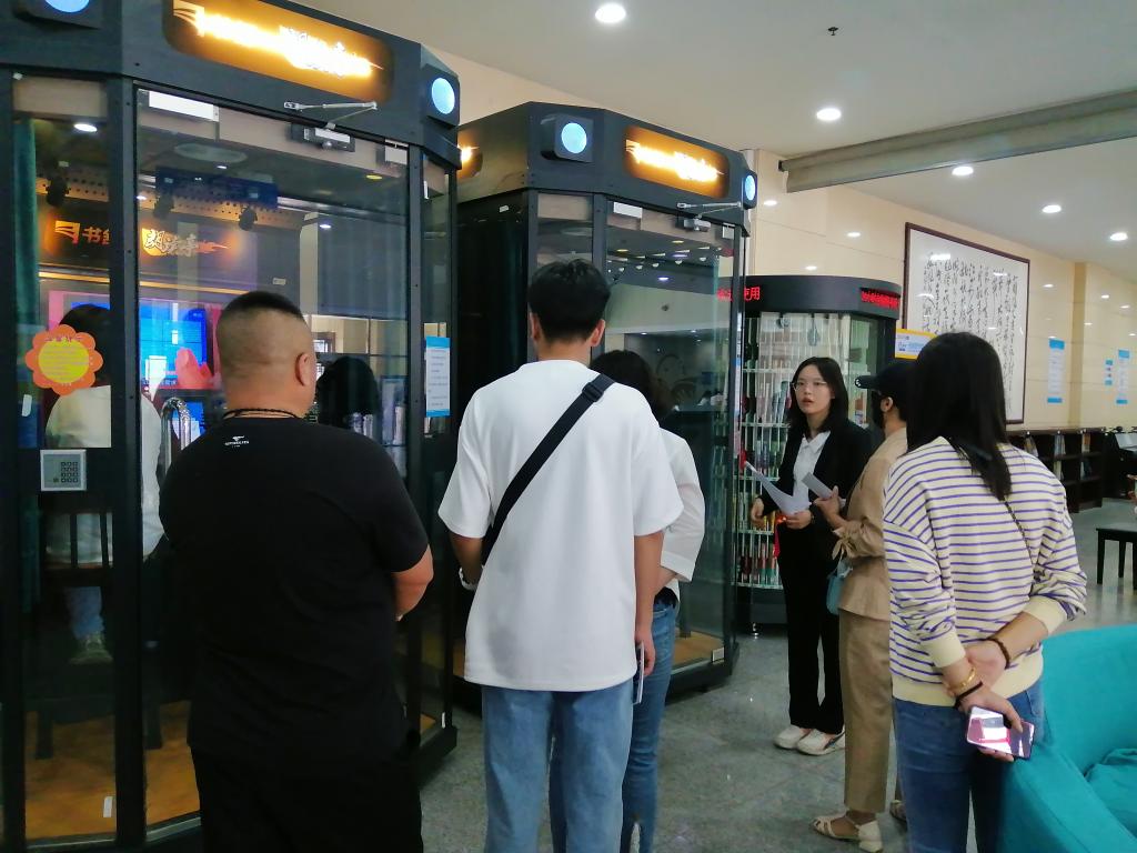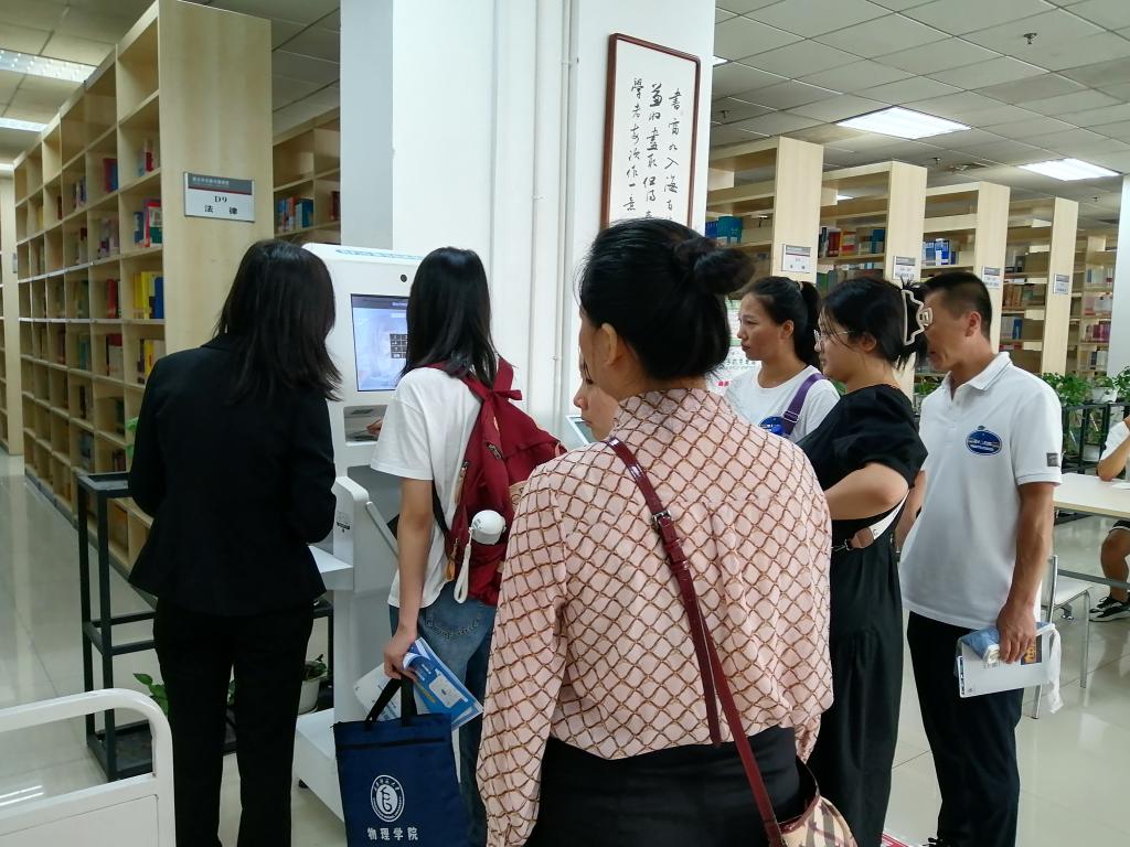 享阅读书会成员带领2023级同学实地体验图书馆资源和设施设备的利用。带领新生及家长参观图书借阅室,介绍馆藏资源分布;引导新生使用检索机,查找定位自己需要的图书;指导新生使用“自助借还机”,现场演示借阅流程,讲解借阅规则;带领新生参观自修室,实地演示预约选座流程;带领新生参观多功能体验区,体验各种数字阅读设备。