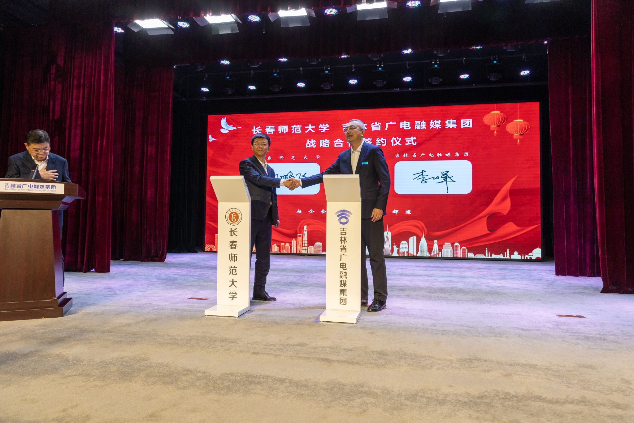 10月27日上午,我校与吉林省广电融媒集团战略合作签约暨融媒体产业学院揭牌仪式在省广电融媒集团举行。省委宣传部副部长、吉林广播电视台党组书记、台长刘铁铎,党组成员、总编辑谢荣,党组成员、副台长周刚,台务会成员、融媒集团董事副总经理李晖,台务会成员、副总经理张旺,副总经理邓浩、谢宇辉,我校党委书记刘多,党委副书记、校长王延明,副校长刘鹏飞出席签约仪式。