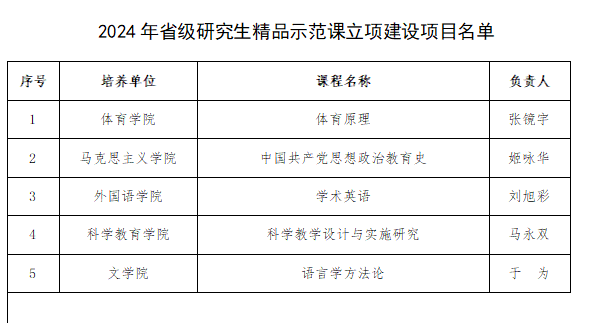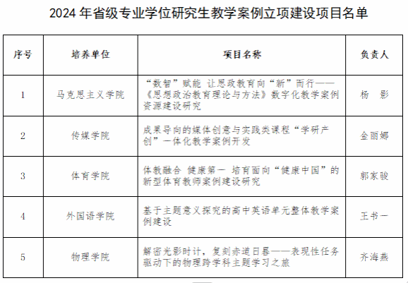 近日,吉林省教育厅公布了2024年省级研究生精品示范课、专业学位研究生教学案例立项建设项目名单,我校获批吉林省研究生精品示范课程立项建设项目5项、吉林省专业学位研究生教学案例立项建设项目5项。