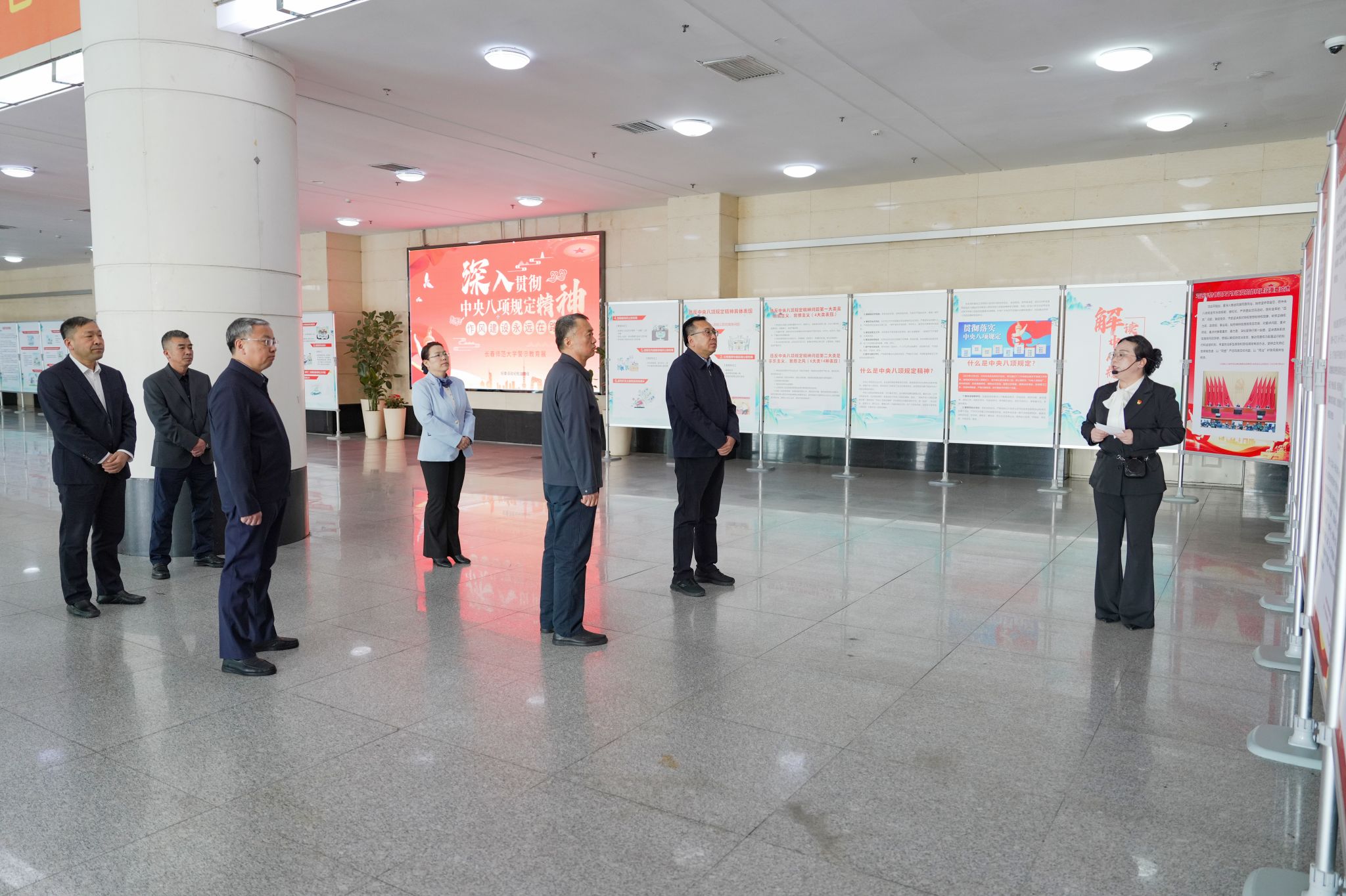 为贯彻落实全面从严治党战略部署,推进深入贯彻中央八项规定精神学习教育走深走实,进一步强化作风建设,增强廉洁自律意识,5月21日,学校领导班子全体成员前往教学综合楼二楼大厅,参观“作风建设永远在路上—深入贯彻中央八项规定精神学习教育”警示教育展。