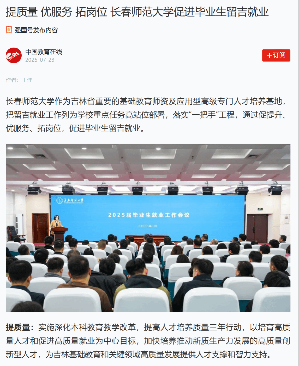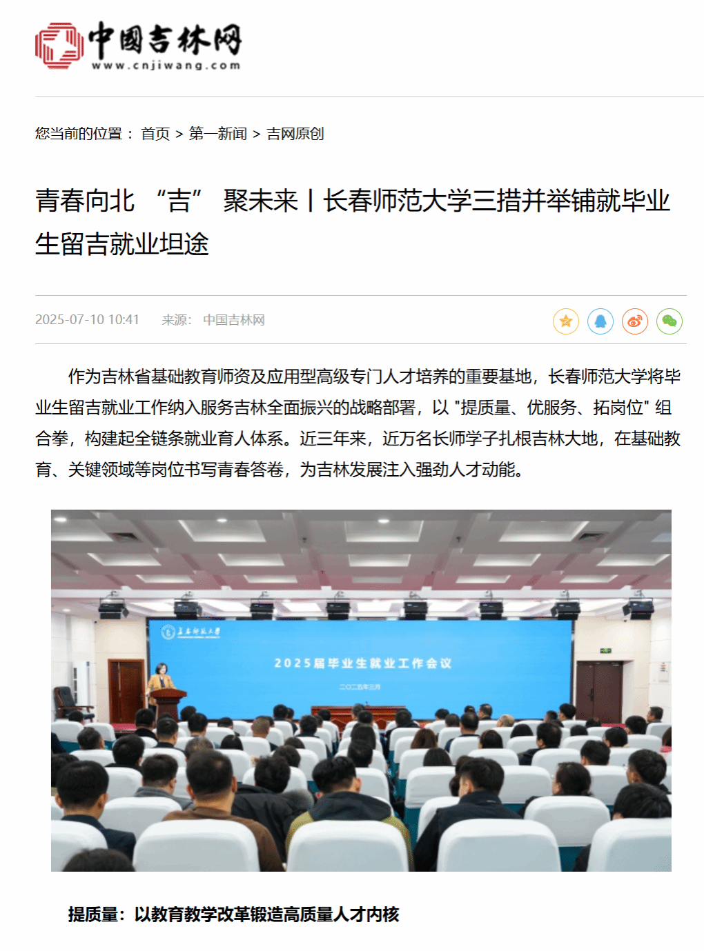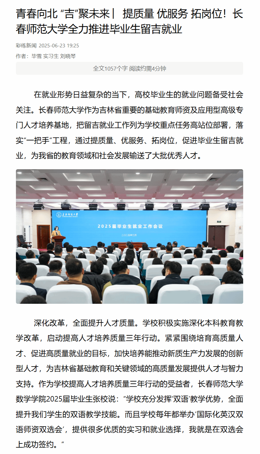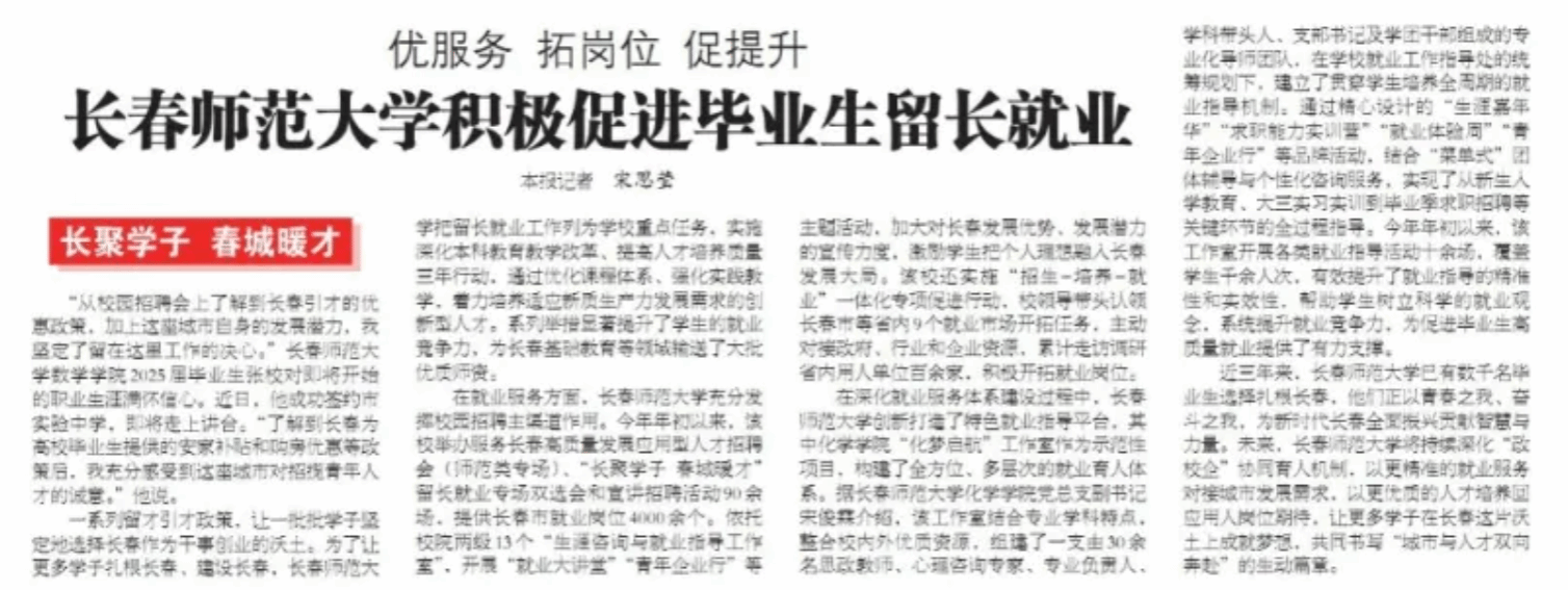 近日,吉林新闻联播、吉林日报、中国吉林网、长春新闻、长春日报、中国教育在线(强国号)等多家媒体报道我校促进毕业生留吉就业工作成效。同时,我校外国语学院2013届毕业生杨瑞作为吉林省高校毕业生就业创业典型人物、政法学院2025届毕业生胡棋铖作为大学生志愿服务西部计划代表接受吉林广播电视台、吉林电视台采访。